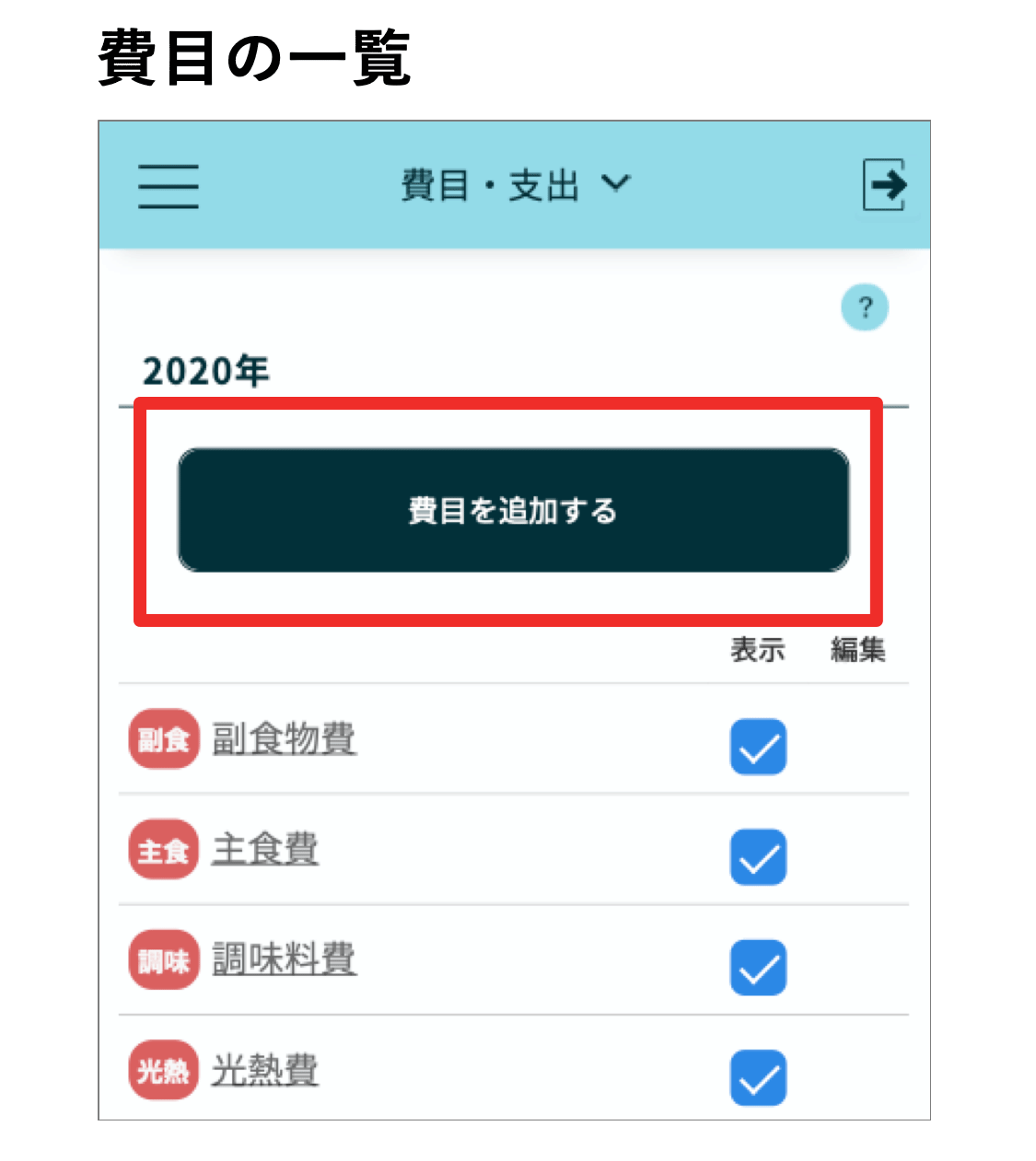 費目の一覧画面にある「費目を追加する」を押して、「費目登録(支出)」の画面に移動します。