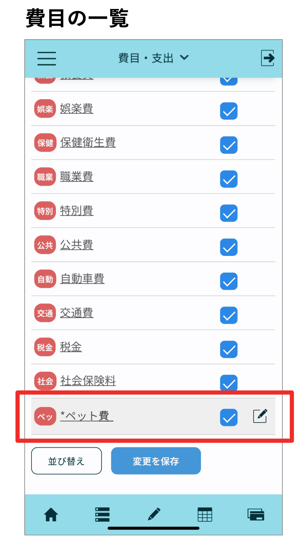 費目一覧に「ペット費」が追加されました。設定内容を変更したい場合は、右端の編集ボタンから変更が可能です。