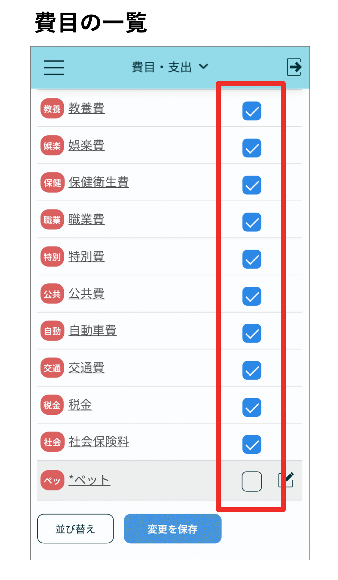 費目の一覧画面のリストの右にある、チェックボックス(赤枠)で表示/非表示の切り替えができます。