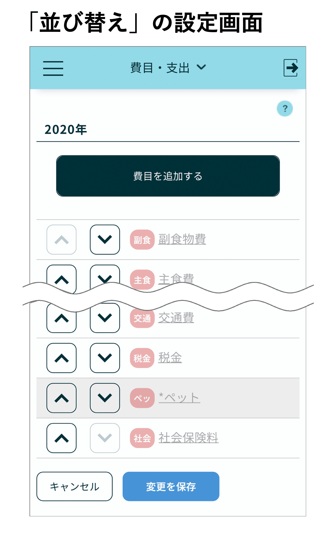費目一覧画面の左下にある「並び替え」を押すと、右の図の画面になります。