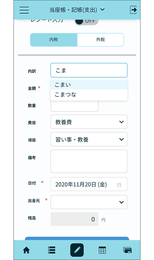 【記帳(口座)画面で入力】 金 額: XXXX円 費 目: 投資 項 目: 出資金 出金元: 生協宅配 入金先: 生協の出資金