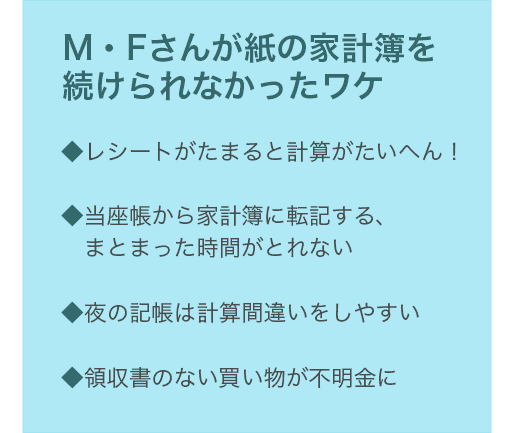 ※記帳(口座)の費目は、「口座の動き」「貯蓄」「投資」「保険」とあります。「貯蓄」または「投資」で費目分けに迷ったときは、その商品が元本保証であれば、貯蓄と判断します。「保険」は、貯蓄性のある保険です。掛け捨ての保険は「特別費」に記帳します。 Q. 食料品の買い出しで駐車料金を支払いました。駐車料金は何費になりますか? A. 駐車料金、交通費、送料などは、目的別に費目分けをすることが望ましいです。食料品(主に副食物費)の買い出しで駐車料金を支払ったら、副食物費です。ほかに、外食に伴う駐車料金なら主食費、映画を見たのなら娯楽費になります。