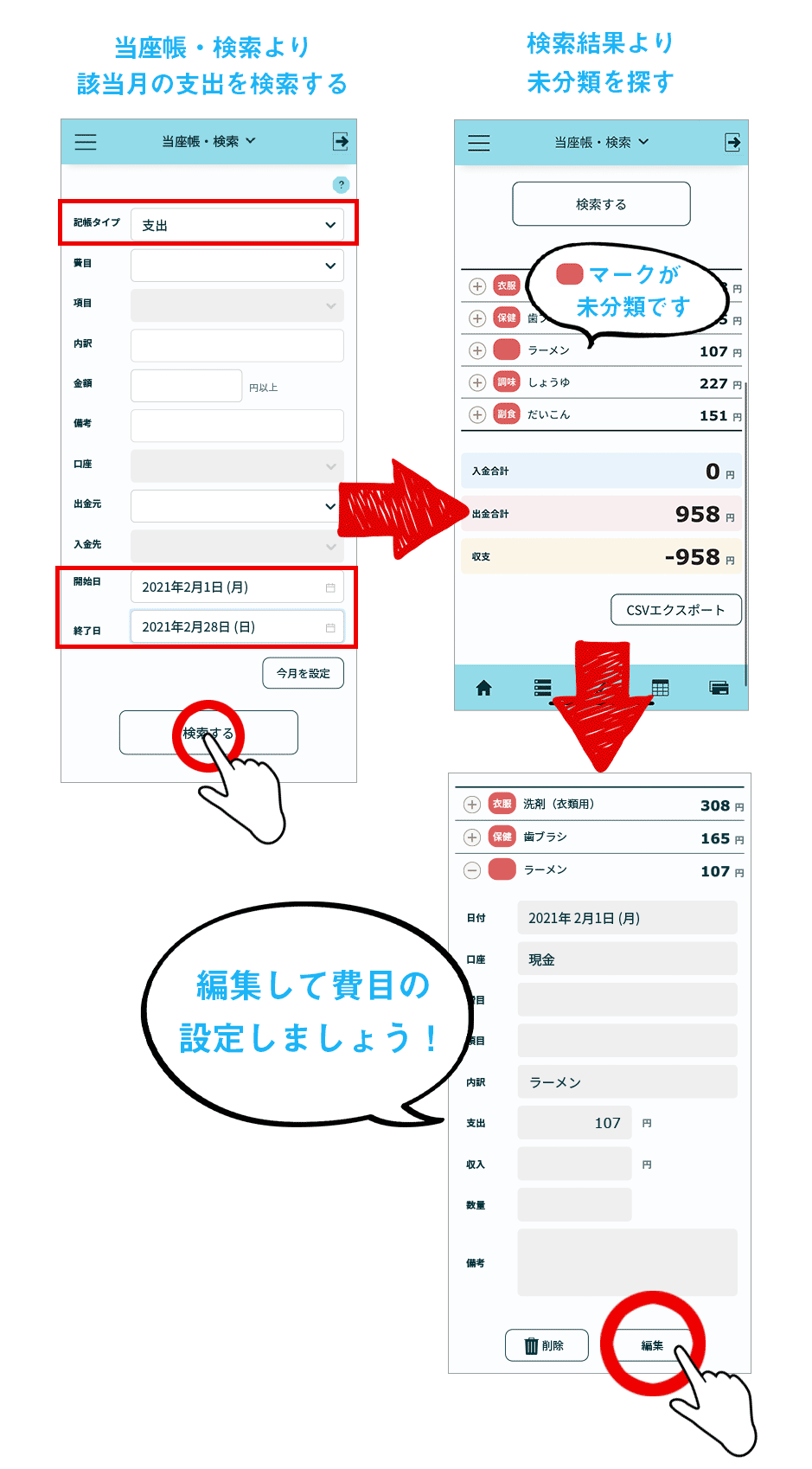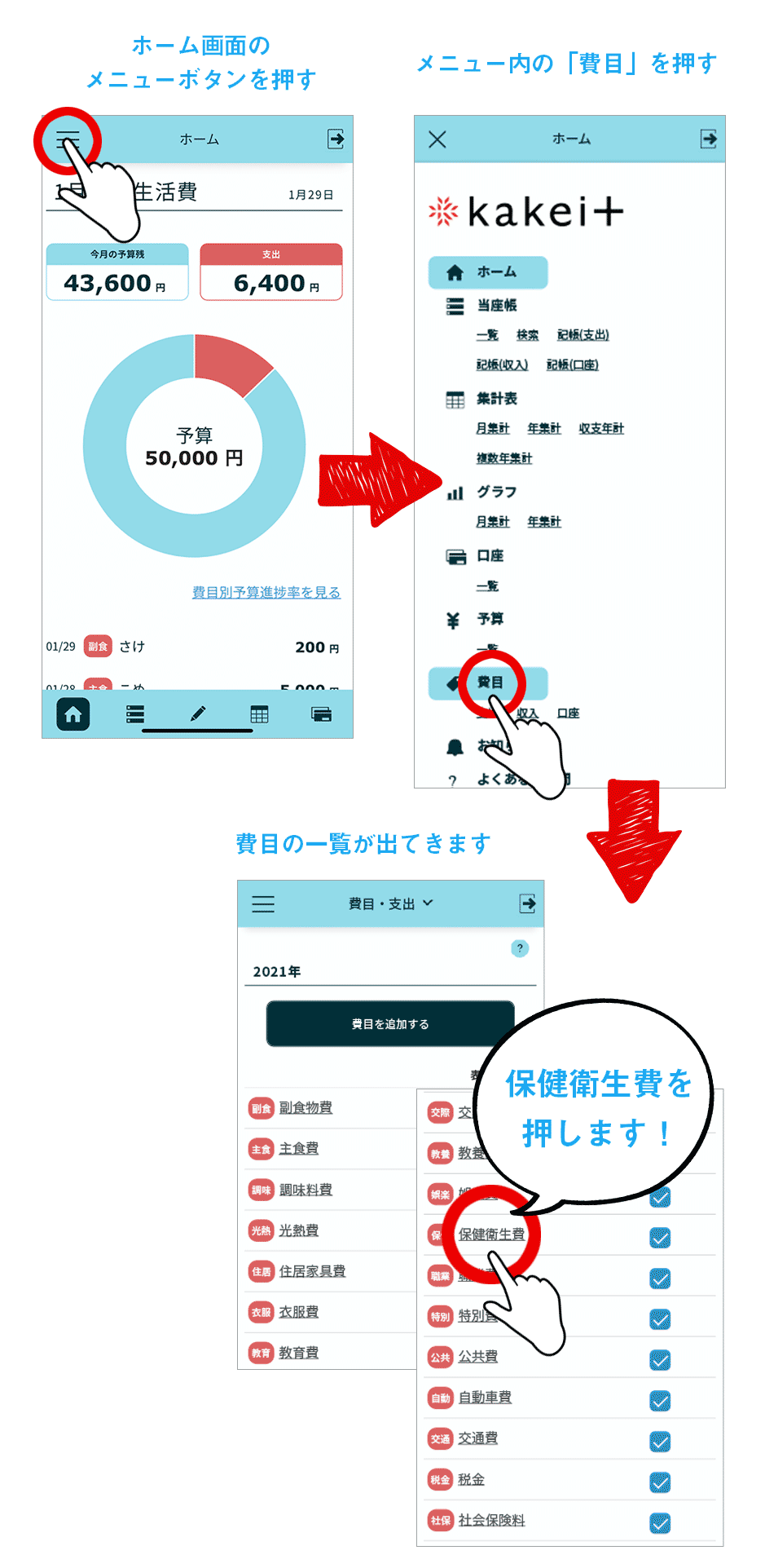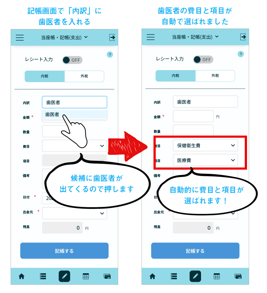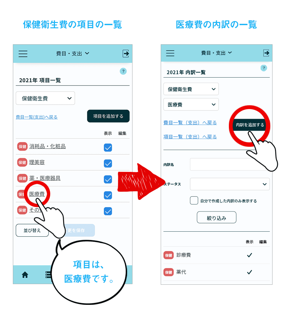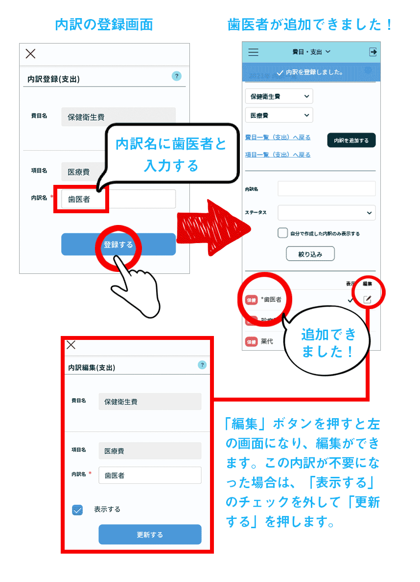 *一度作った内訳は、削除できませんが、編集画面の「表示する」のチェックを外すことで非表示となり、見えなくすることができます。 これで内訳の追加は完了! 内訳が追加されると、記帳画面に内訳を入れた際に、費目、項目の自動アシスト機能が働きます。