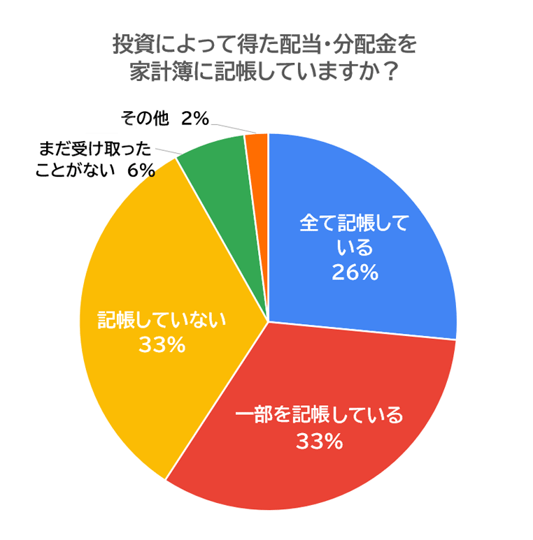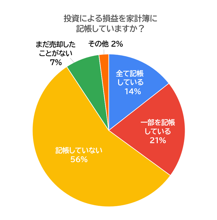 全て記帳している 14% 「売却したとき、利益確定の通知ハガキが届いたら、運用益は収入に計上する。投資元本の払戻分は口座移動で計上する」 「銀行口座から出し入れしているので、通帳と合わせたほうがスッキリする」